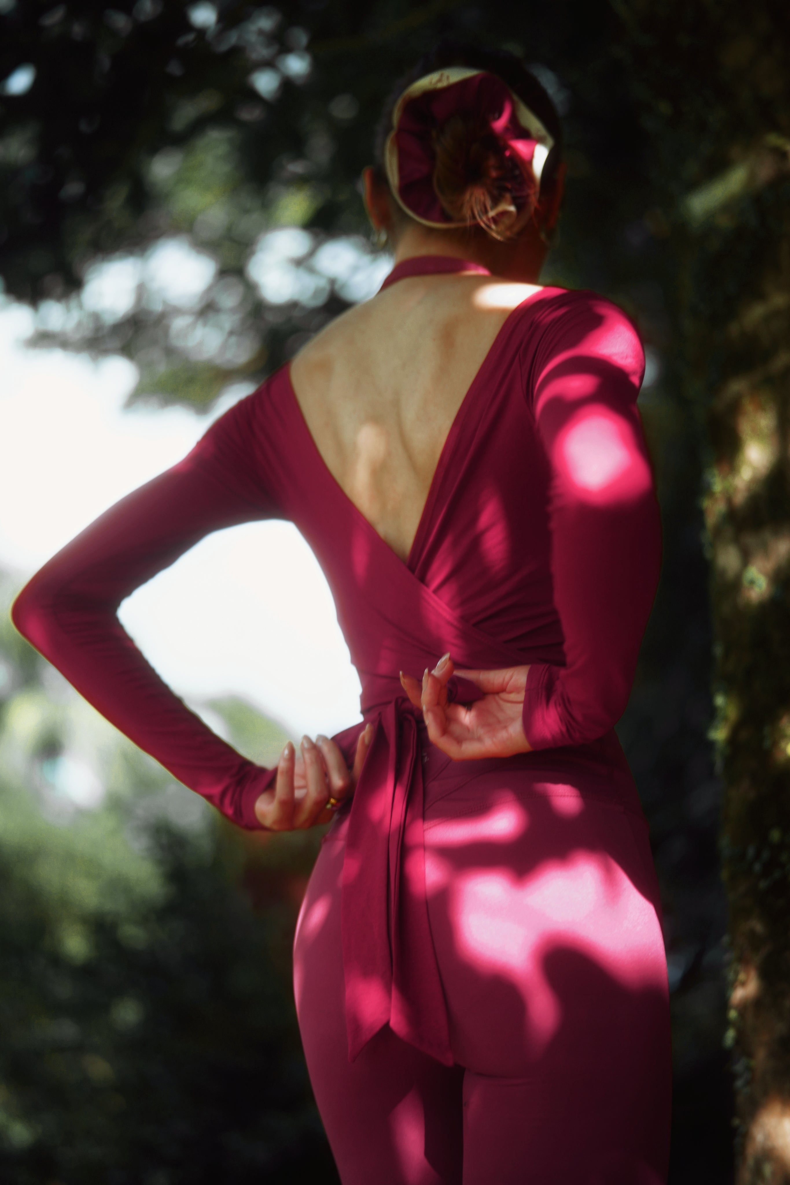 【設計靈感:優雅的轉场藝術】 Ballet Wrap Top 汲取了古典芭蕾舞者練習服的靈魂,將那份輕盈與紀律帶入當代運動生活。選擇 Burgundy (酒紅色),是因為它如同陳年紅酒般,代表了內在力量的沈澱與綻放。