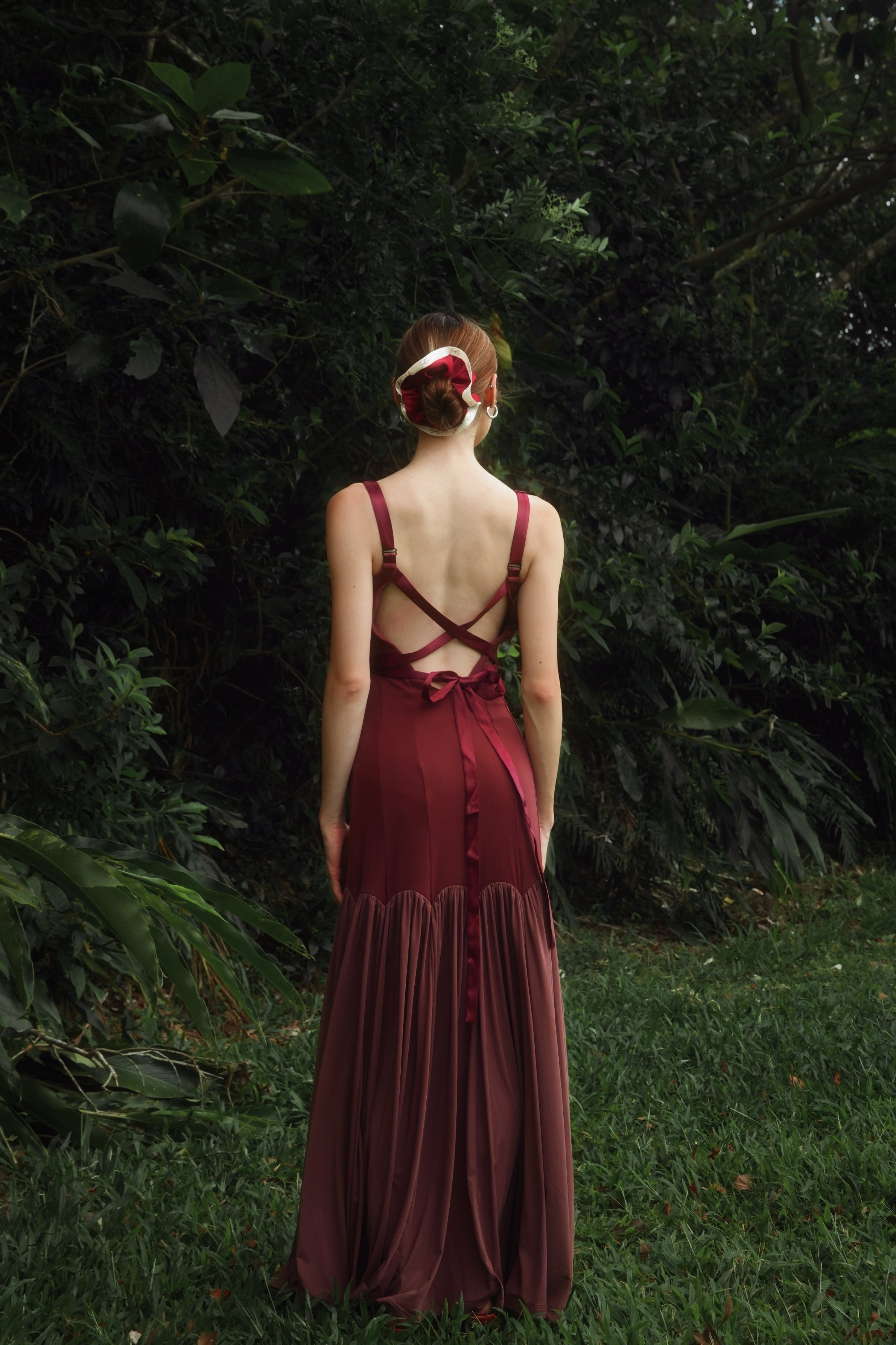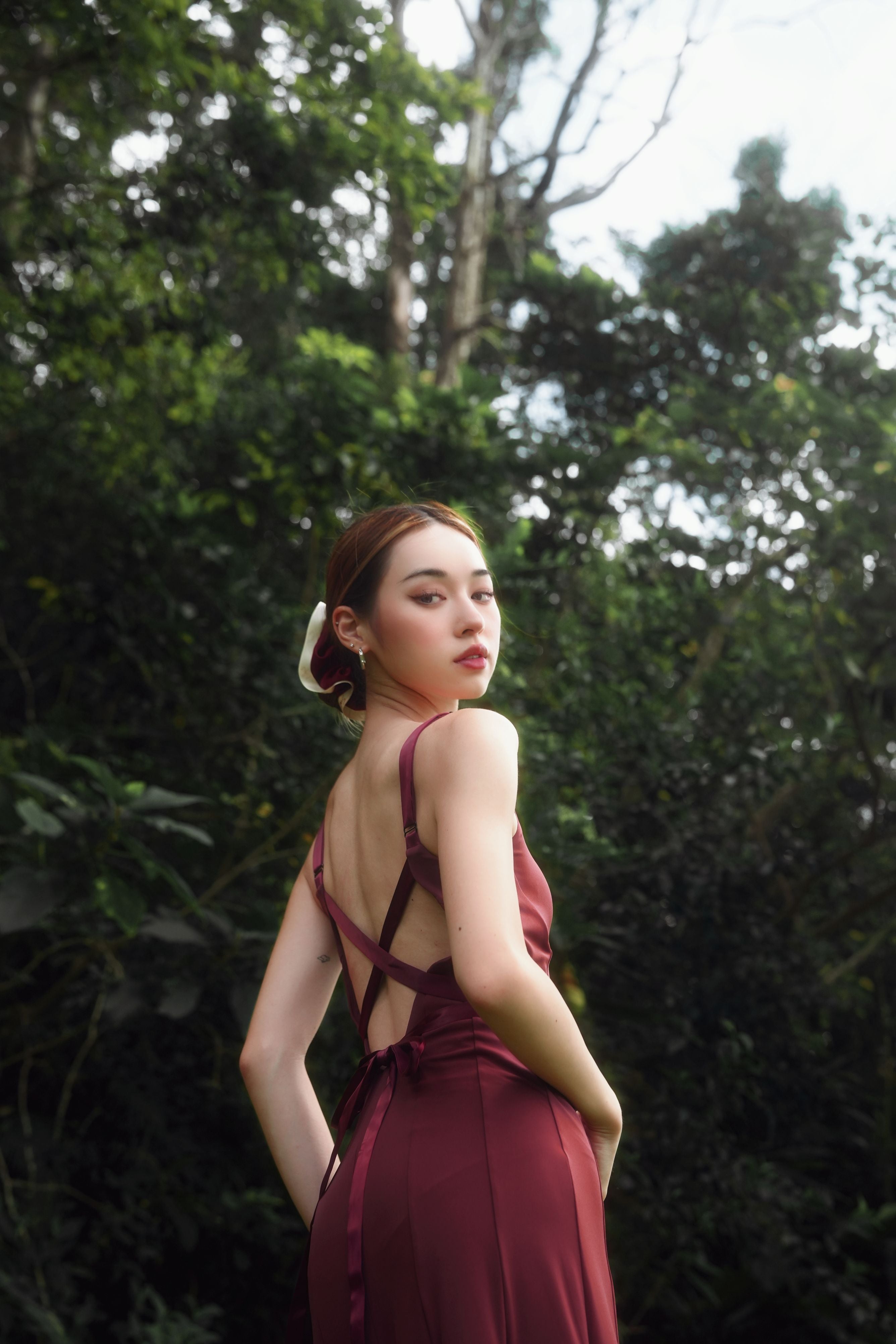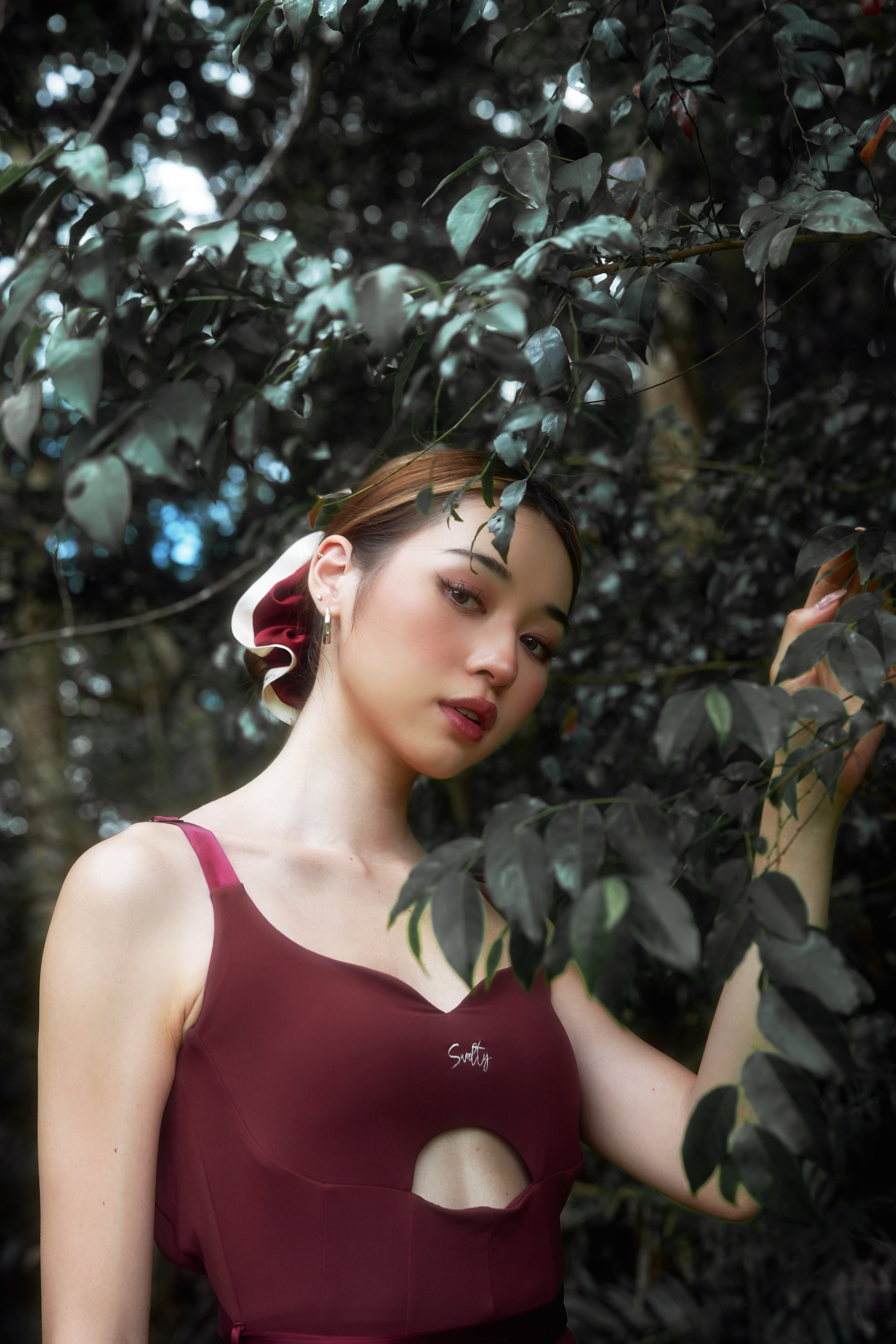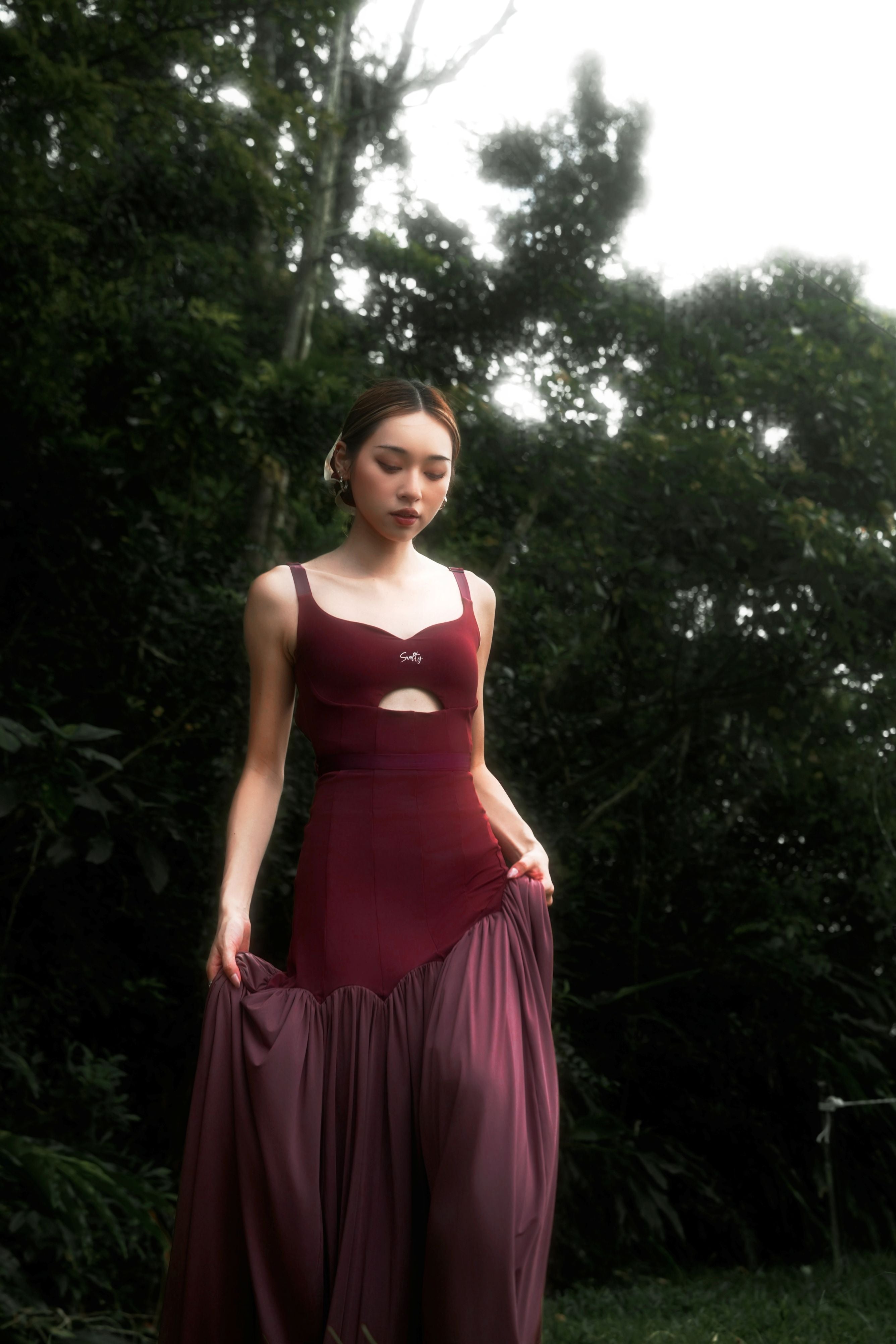 深邃的 Burgundy (酒紅色) 赋予了這款裙裝一種如陳年紅酒般的沉穩氣息。對於那些內斂、優雅卻在細節處展現鋒芒的女性而言,這款洋裝是妳沈默而有力的自我表達。它在 Salty (堅毅的線條) 與 Sweet (流動的裙襬) 之間,勾勒出獨一無二的藝術輪廓。