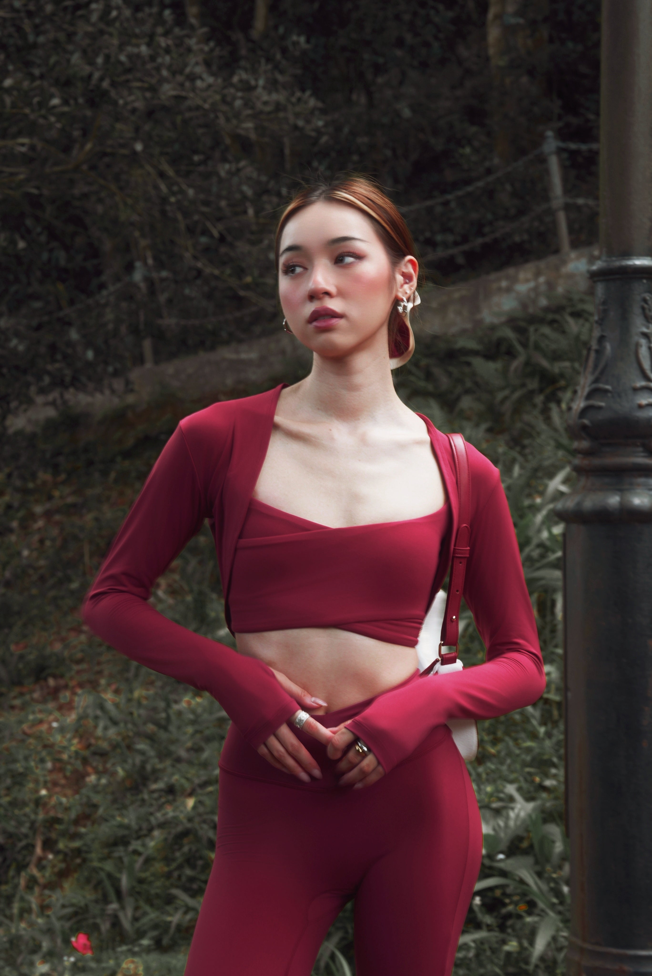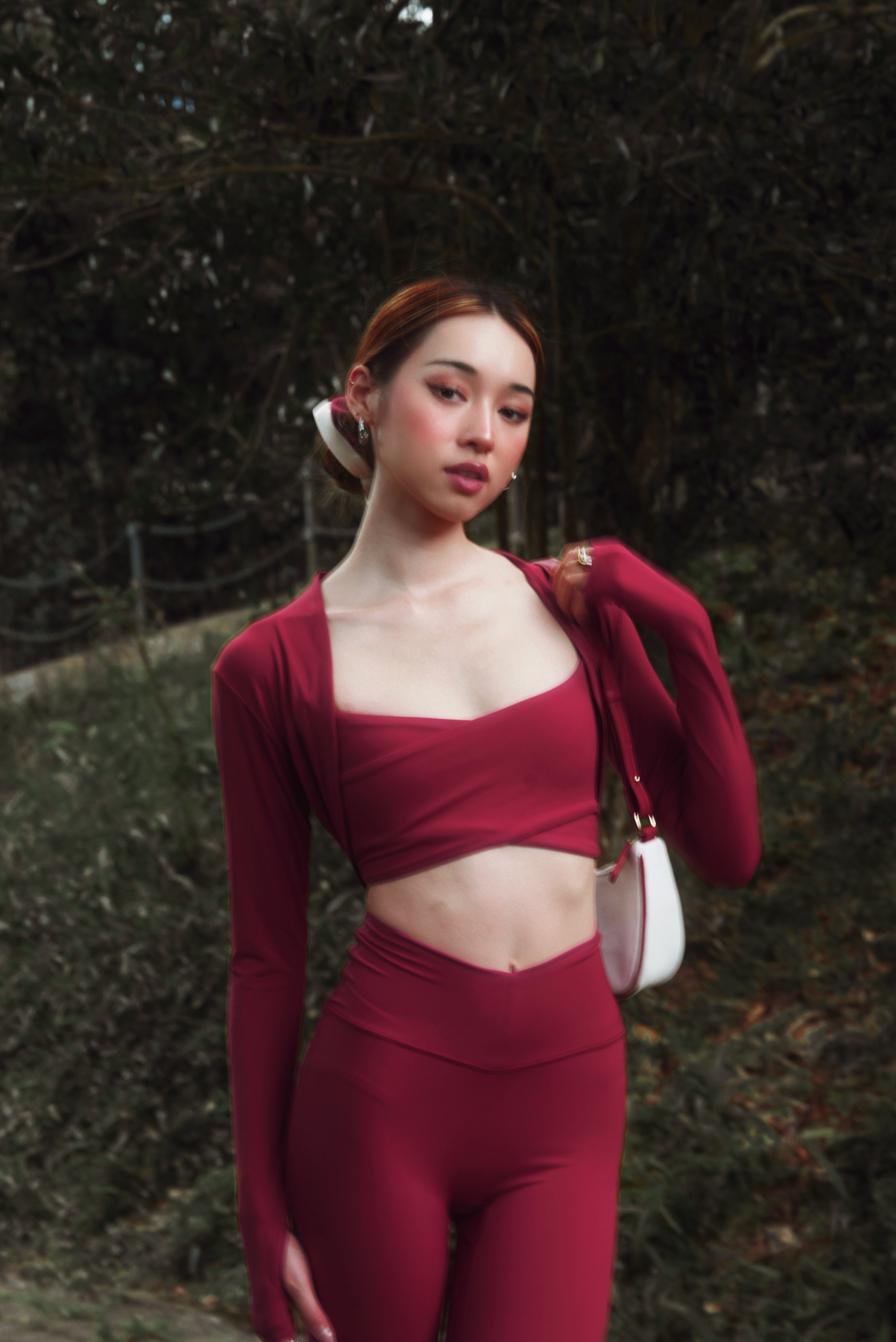 「罩衫的存在,是為了讓性感變得更有層次。酒紅色 Bolero 就像是一層輕盈的濾鏡,讓妳的運動造型瞬間充滿知性魅力。」