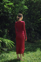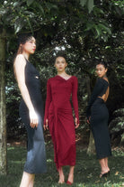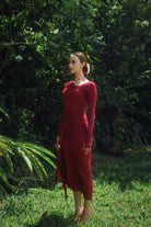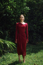 The Clown – Burgundy Long Sleeves Dress,優雅與俏皮相互交融。柔軟的酒紅色布料貼合身形,腰間的綁帶勾勒出曲線,展現細緻輪廓。斜領口的綁結設計增添了一抹意外的俏皮感,為整體造型注入戲劇性的魅力。彷彿將馬戲團表演者的靈動與高貴演繹其中。