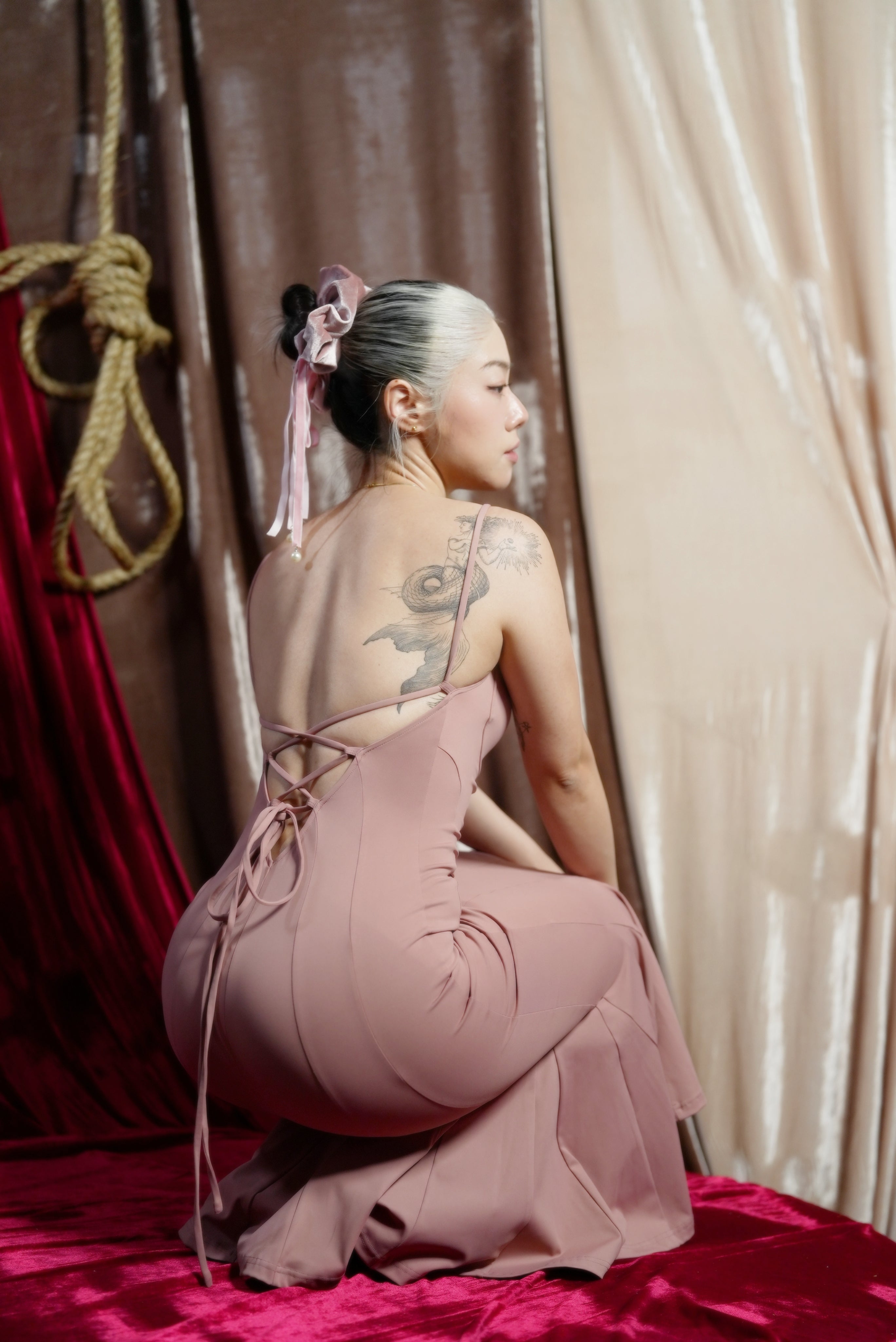 The Trapeze Artist – Pink Backless Mermaid Dress ,展現如空中表演者般自由優雅。柔軟的粉色布料如第二層肌膚般貼合身形,露背設計搭配後背綁帶,令人聯想起迷人的馬戲團戲服。美人魚裙襬隨著每一個動作輕輕擺動,彷彿一件隨時舞動的藝術品。