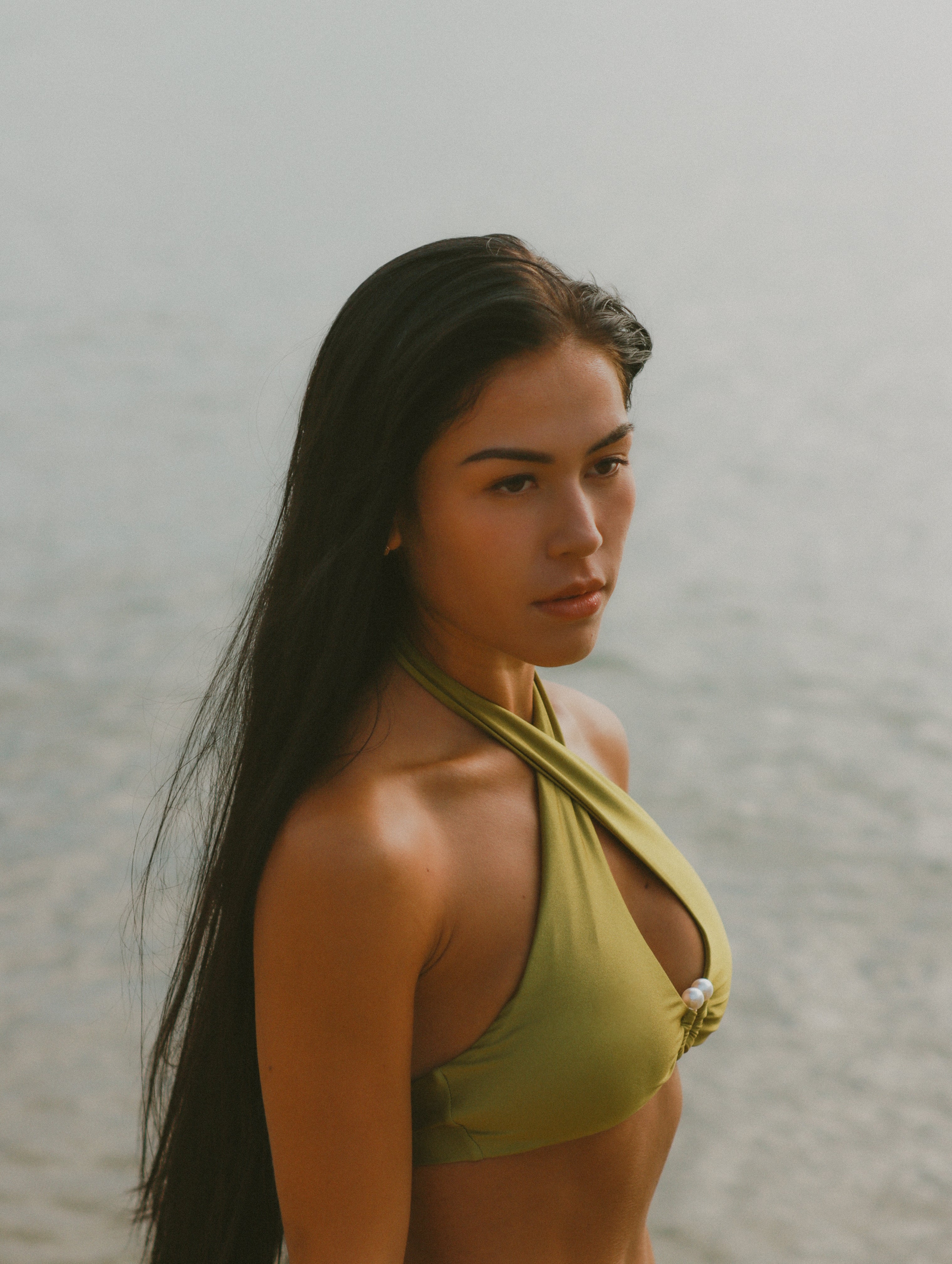 The criss cross design of Pudding Bikini top highlights the elegance of women and provides a flattering fit that accentuates your collarbone. Mix and match this black or green swimwear with other color in our collection to create the unqiue summer look!