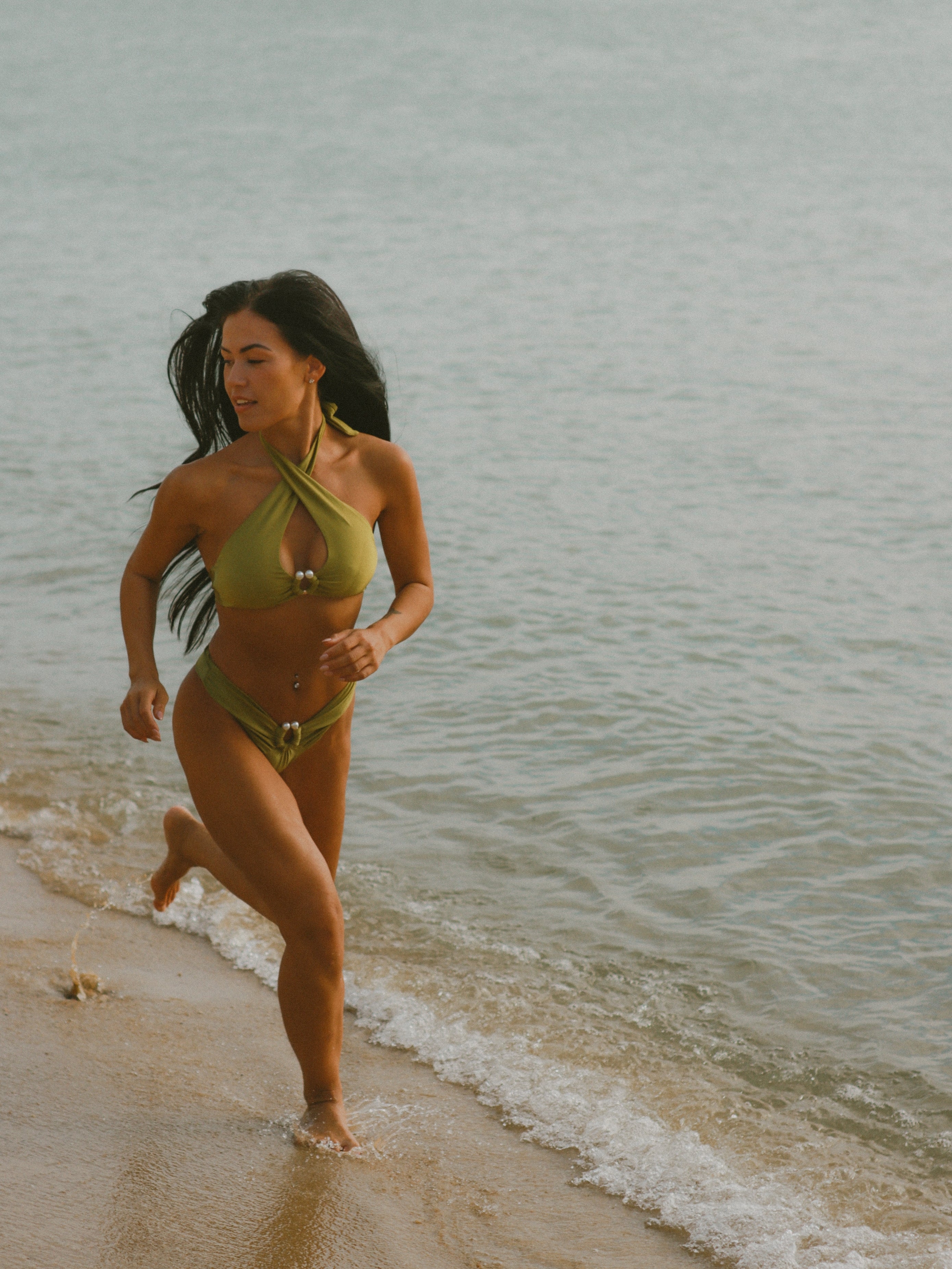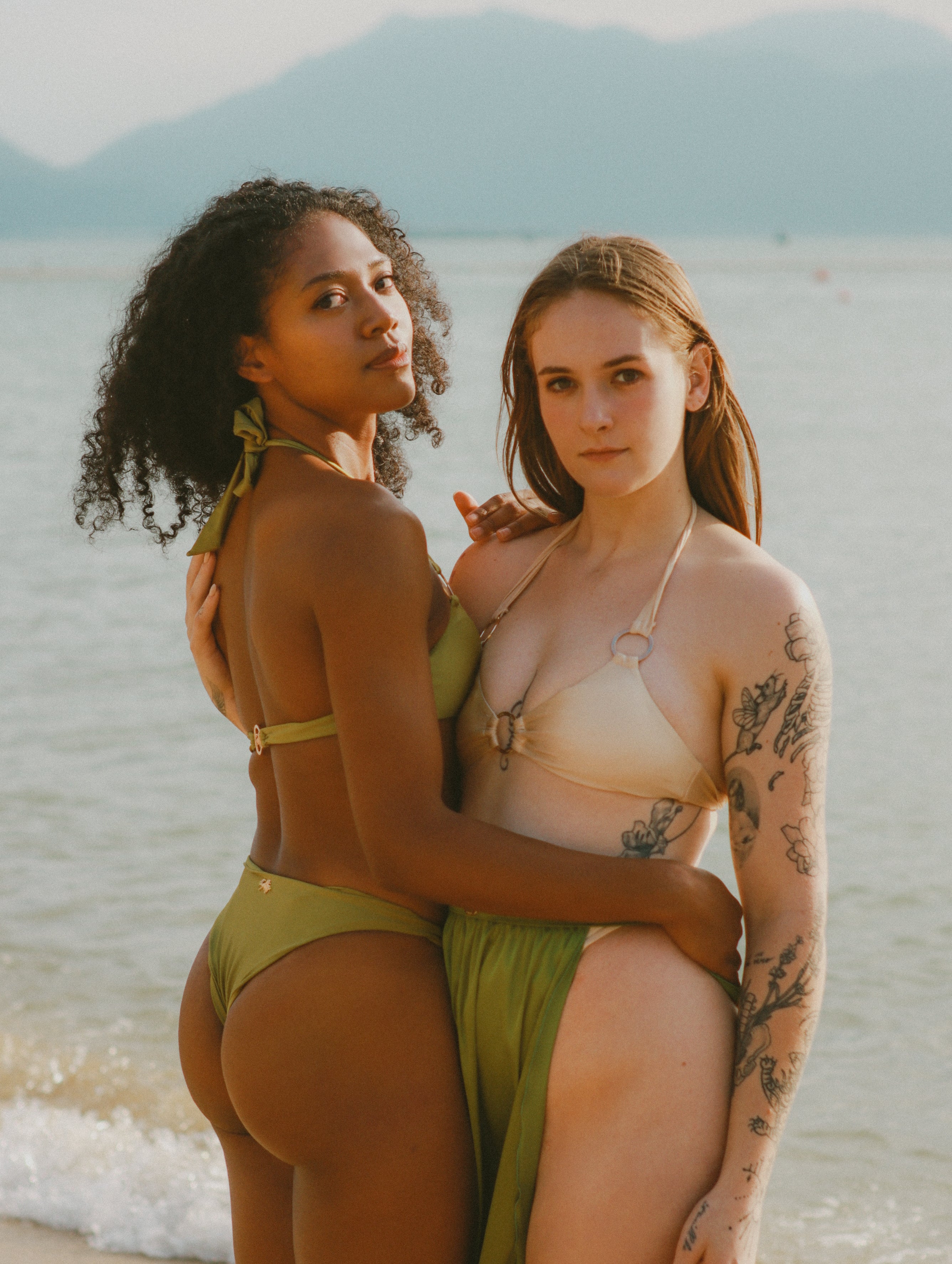 Pistachio Ice Cream Bottom | Pistachio Ice Cream: Minimalist Seamless Slim Fit Swim Trunks & Fair-Skinning Morandi Green Nude-Looking Long-Legged Bikini